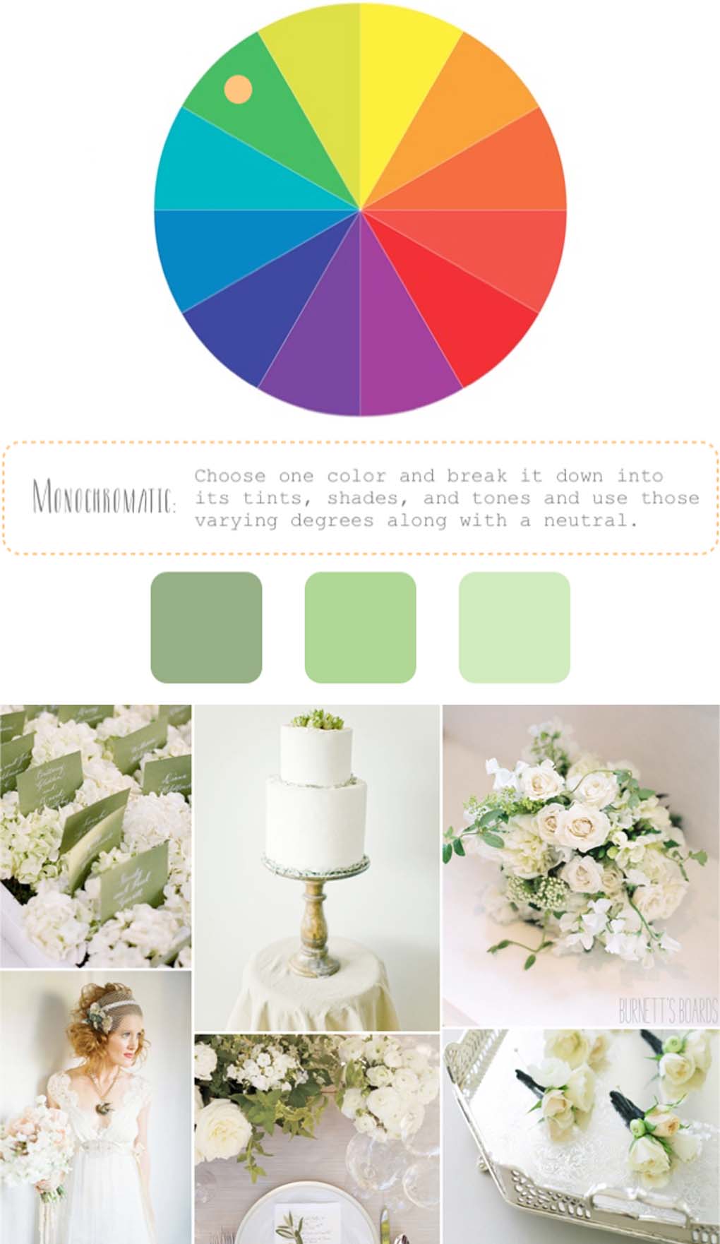 為一個(gè)單色的婚禮選擇一種顏色,然后把它分解成小家庭(PS:從色溫、陰影、色調三方面入手),并添加你的素色。我選擇綠色做主色,作用是讓人眼前一亮,白色作為輔導的素色。單色婚禮我絕對喜歡,因為做好之后它看起來(lái)既別致又復雜。