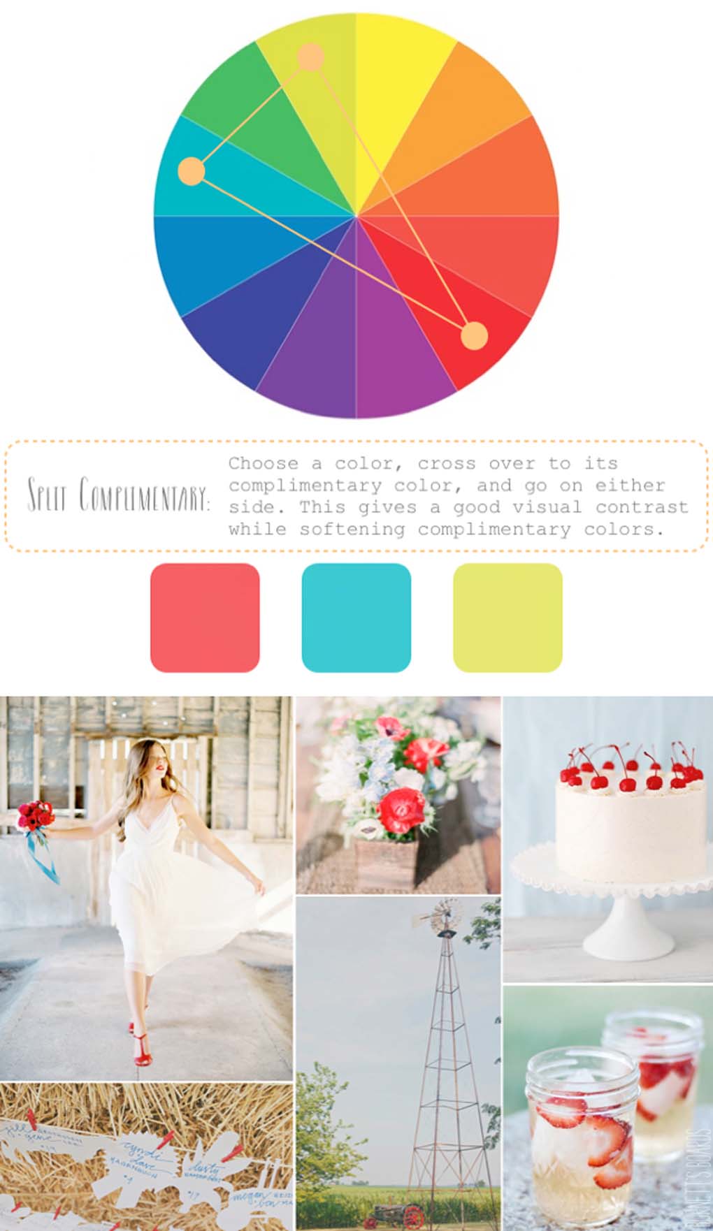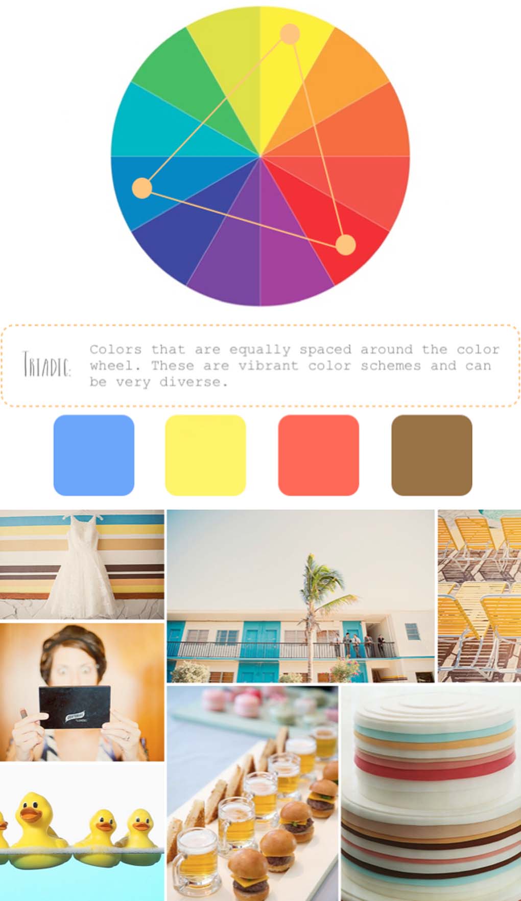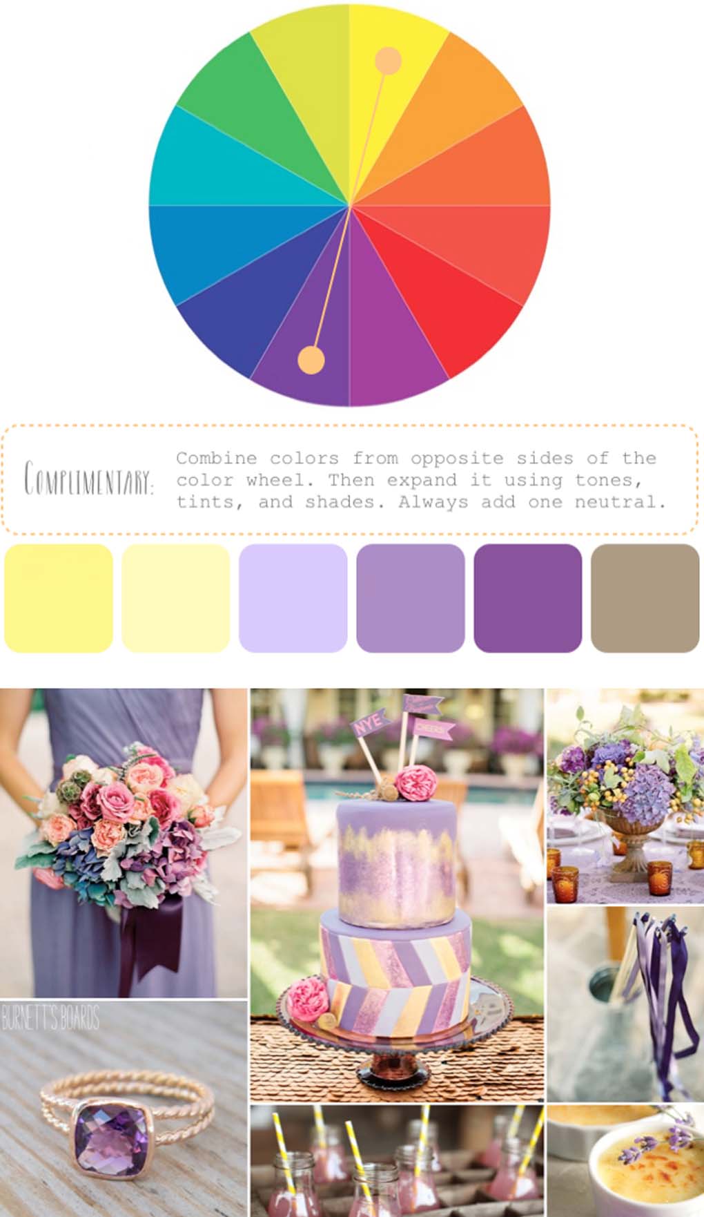 用活潑多樣的顏色組合制作一個(gè)三色配色方案,三種顏色在色輪上要呈正三角分布,例如黃色、藍色和紅色。這三種顏色正好是三原色——但如果你想婚禮看起來(lái)級別高點(diǎn)兒千萬(wàn)別直接用,你要把每一個(gè)顏色按色溫、陰影、色調分成小家庭,然后與你選擇的素色搭配,做成你愛(ài)的樣子~