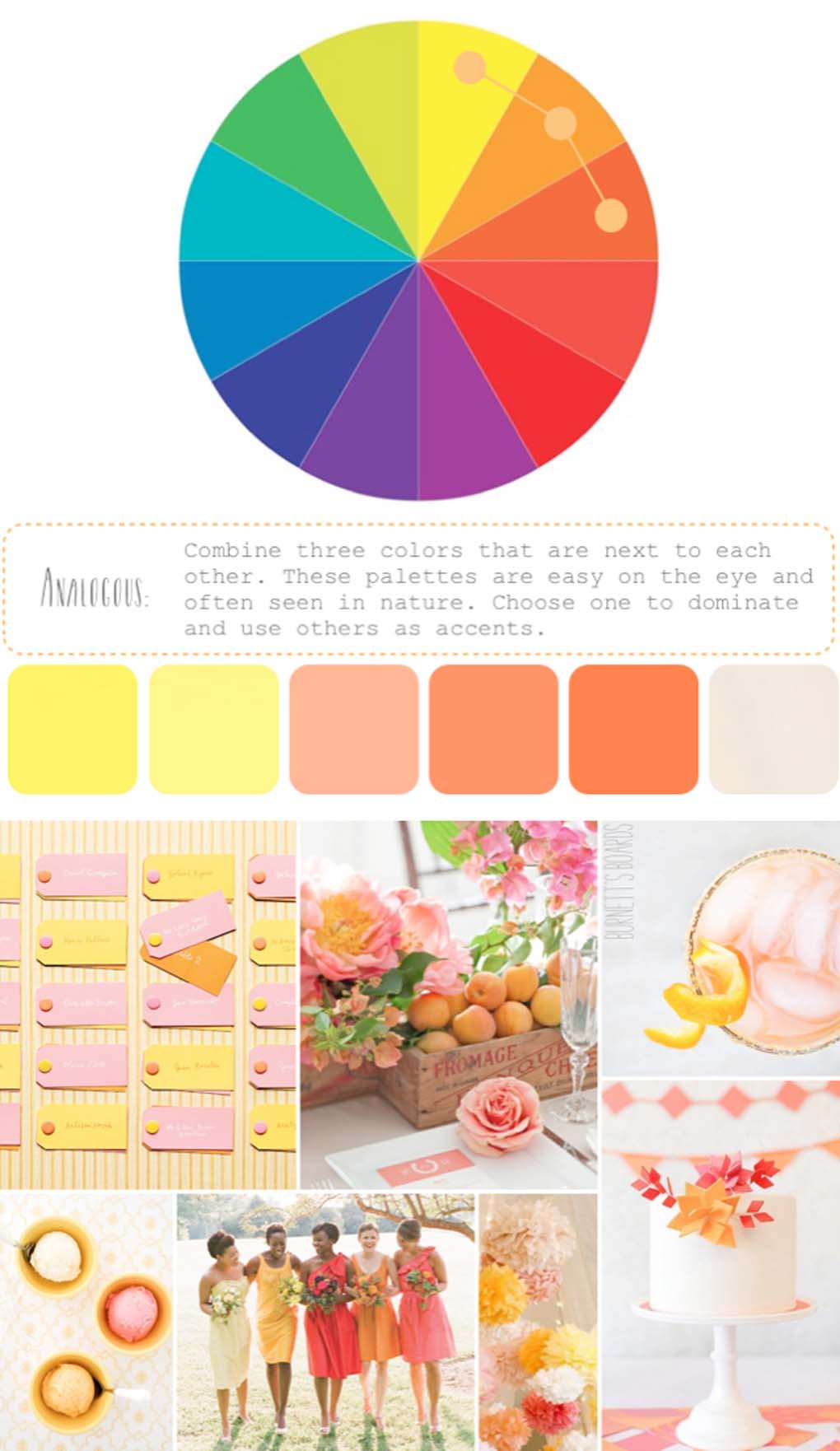 基本的色輪要分為暖色和冷色,例如藍色和綠色在一邊,黃色和紅色在另一邊。中間的顏色可冷可暖,主要看你怎么搭配。至于婚禮的風(fēng)格和設計,你要避免使用原色,因為原色會(huì )讓你的作品看起來(lái)像是幼兒園級別。