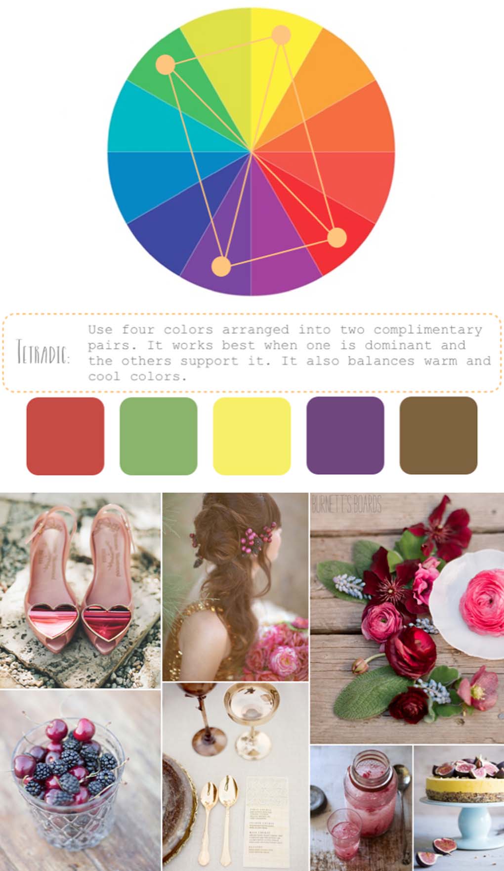 四色式調色盤(pán)的組合像一個(gè)矩形(如下圖),它最好的使用方法是:選擇一種做主色(包括它的深淺色),其他三色做輔助,輔助中選擇一種做“POP”——活躍色。四色式最初看起來(lái)會(huì )有點(diǎn)復雜,不過(guò)這只是兩組互補的顏色而已。下面的例子里,主色是紅色系,黃色作為“POP”色,綠色和紫色做輔助。